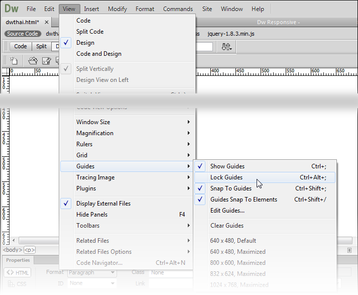 Rulers หรือไม้บรรทัดขึ้นมาแล้ว ผู้ใช้งานโปรแกรม Dreamweaver สามารถทำการใช้งานเส้นไกด์ได้ ดังนี้