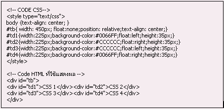 เรามาดู id อื่น ๆ ต่อไป ที่ id="td1" เป็นการกำหนดให้ id นี้อยู่ทางด้านซ้าย โดยที่ id="td2" อยู่ทางด้านขวา โดยการกำหนดให้อยู่ในตำแหน่ง ซ้าย หรือ ขวานี้ เราสามารถกำหนดได้จาก float ถ้ามีการกำหนดเป็น none นั้นคือการกำหนดให้อยู่ในตำแหน่งตรงกลาง (center) เมื่อมีการแสดงผลจากการใช้ CODE CSS ข้างต้นจะได้ ดังนี้